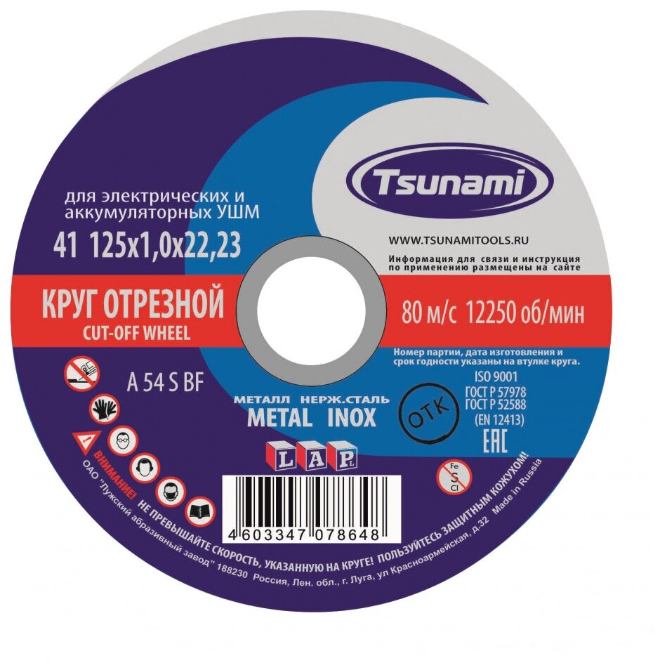 TSUNAMI Круг отрезной по металлу TSUNAMI A 54 S BF Pg, 125 х 22 х 1 мм информация: