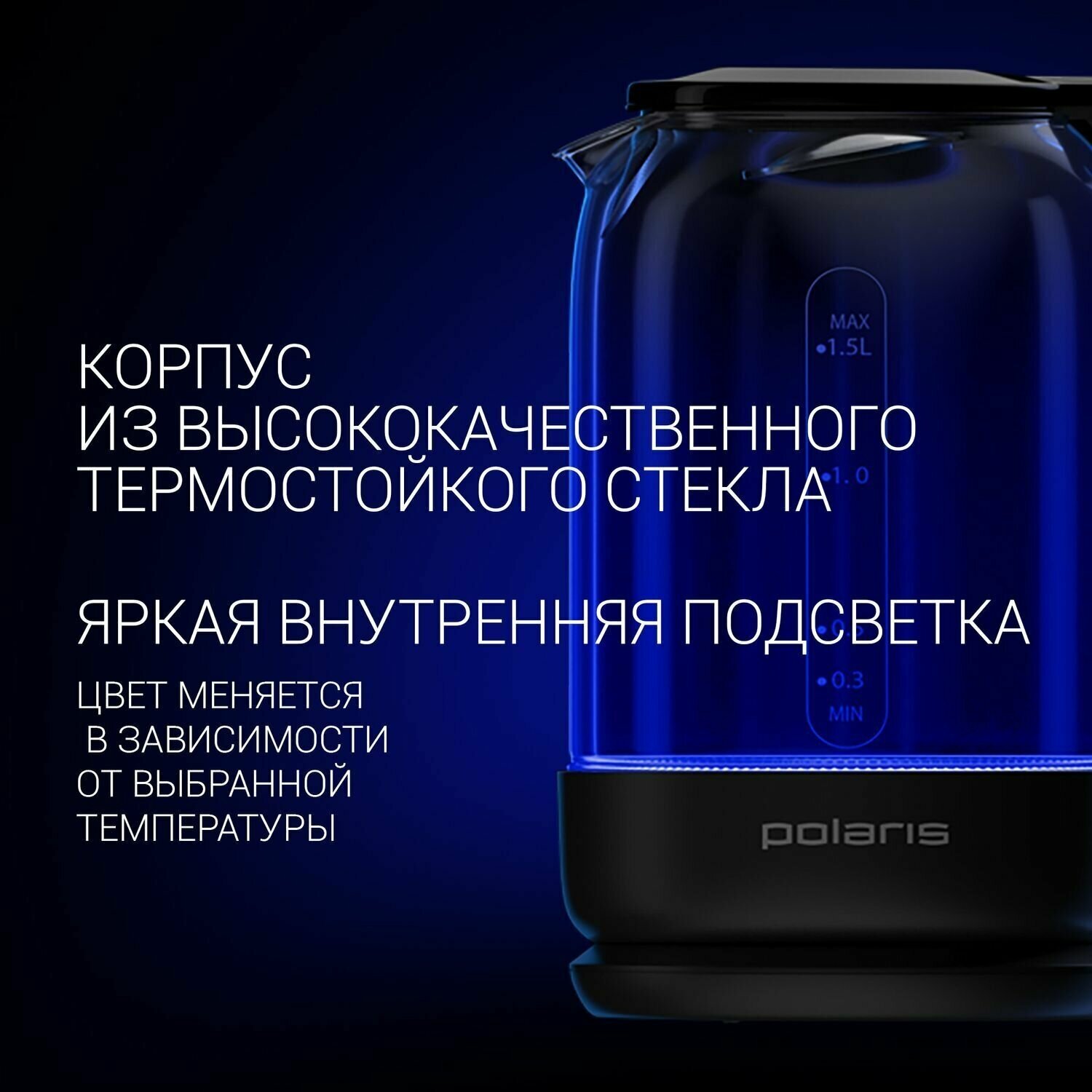 Чайник POLARIS PWK 1720CGLD Wi–Fi IQ Home, 1,5 л, 1800-2150 Вт, закрытый нагревательный элемент, стекло, черный, 54491 информация: