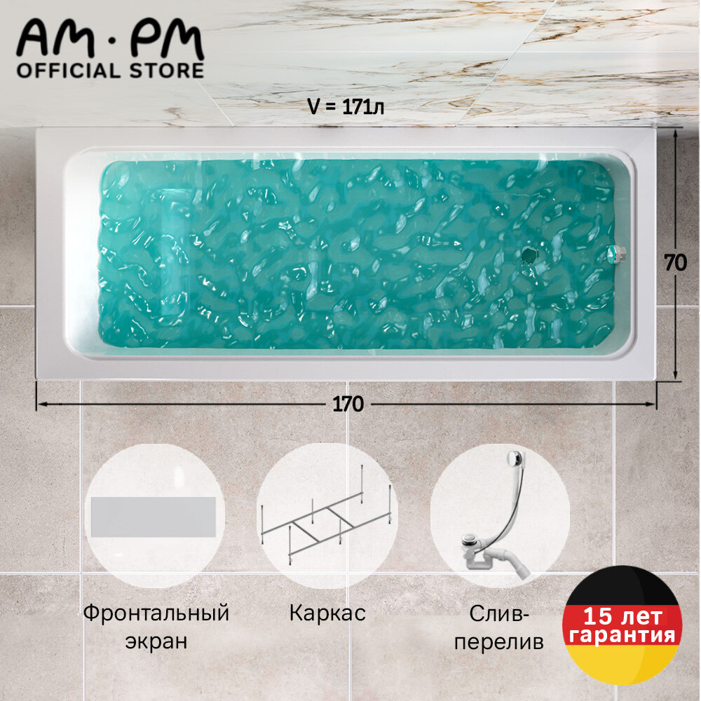Комплект 4 в 1 ванна акриловая AM.PM Gem 170x70 с каркасом, фронтальной панелью, и слив переливом информация: