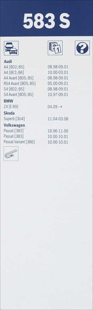 | Совместимость | Audi: A4 [8D2;B5] 11.94-09.01, A4 [8E2;B6] 10.00-03.01, A4 Avant [8D5;B5] 08.98-09.01, RS4 Avant [8D5;B5] 05.00-09.01, S4 [8D2;B5] 10.97-09.01, S4 Avant [8D5;B5] 10.97-09.01 BMW Z4 [E89] 04.09-08.16 Skoda Superb [3U4] 11.04-03.08 Volkswagen: Passat [3B2] 10.96-11.00, Passat [3B3] 10.00-10.01, Passat Variant [3B6] 10.00-10.01 |
