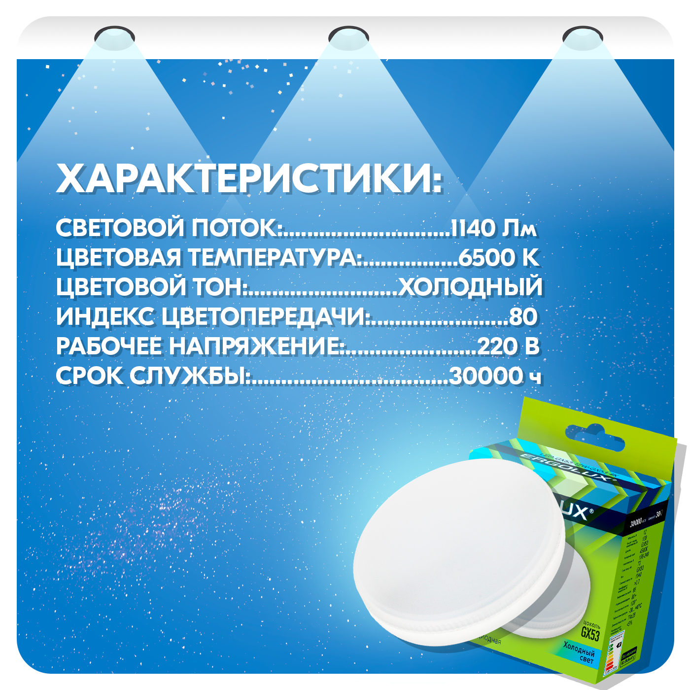 Светодиодная лампа Ergolux, 12 Вт, GX53, холодный свет, форма таблетка, 6500 кельвинов 125 ₽