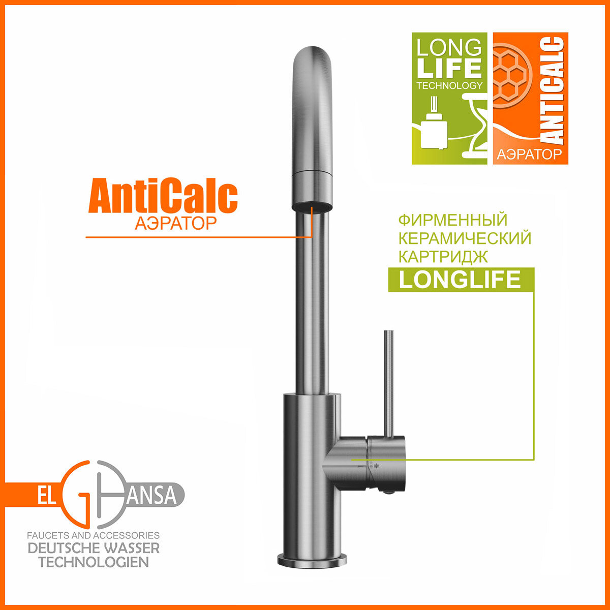 Смеситель для кухни (мойки) из нержавеющей стали, высокий с поворотным изливом ELGHANSA 56B1116-Steel, цвет нержавеющая сталь информация: