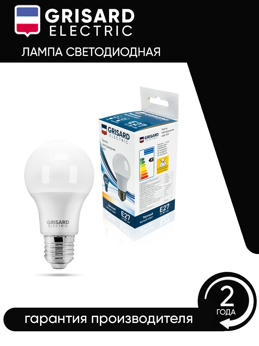 Лампа светодиодная GRISARD ELECTRIC шар A60 Е27 11Вт 3000К 220В 1шт информация: