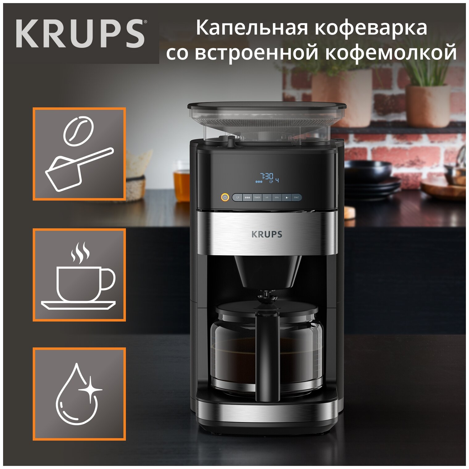 Кофеварка капельная Krups Grind Aroma KM832810, таймер, 3 степени помола, поддержание температуры 30 мин, черный