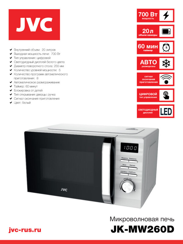Микроволновая печь JVC JK-MW260D белый/черный информация: