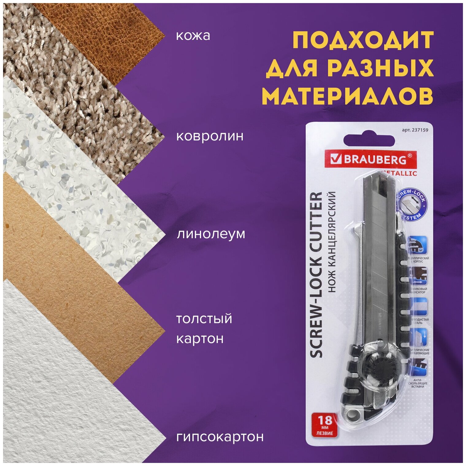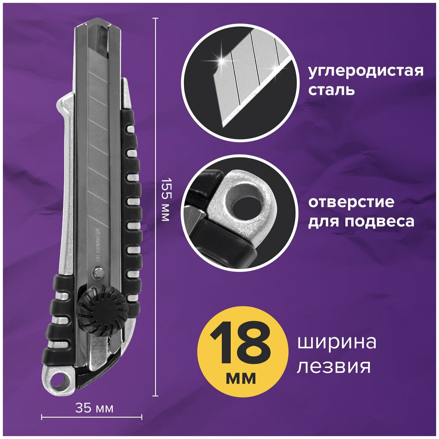Нож канцелярский строительный для резки бумаги 18 мм Brauberg "Metallic", роликовый фиксатор, резиновые вставки, 237159 информация: