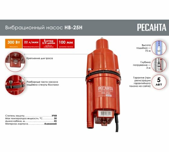 Отзывы на Насос вибрационный НВ-25Н РЕСАНТА ( нижний забор воды, шнур 25 м, с термозащитой, 300 Вт, 22 л/мин, диаметр насоса - 100 мм)