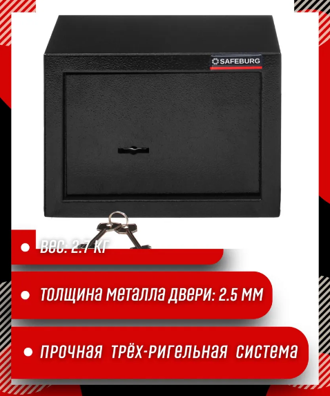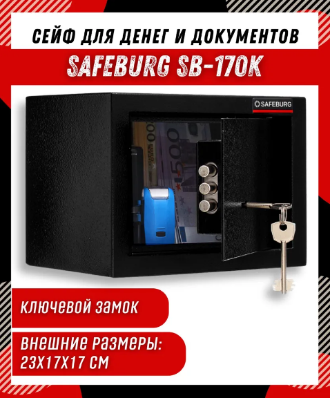 Сейф мебельный SAFEBURG SB-170K черный, для денег, для офиса и дома, с ключевой замок, 23х17х17 см. информация: