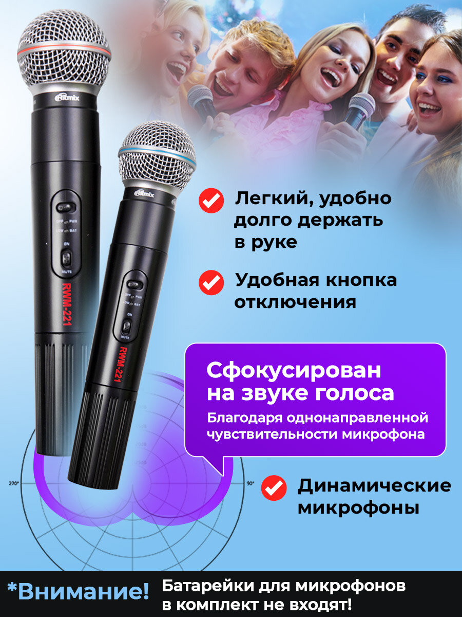 Отзывы на Микрофонная вокальная система беспроводная радио Ritmix, RWM-221 два микрофона, отдельные регуляторы, приём 60 метров