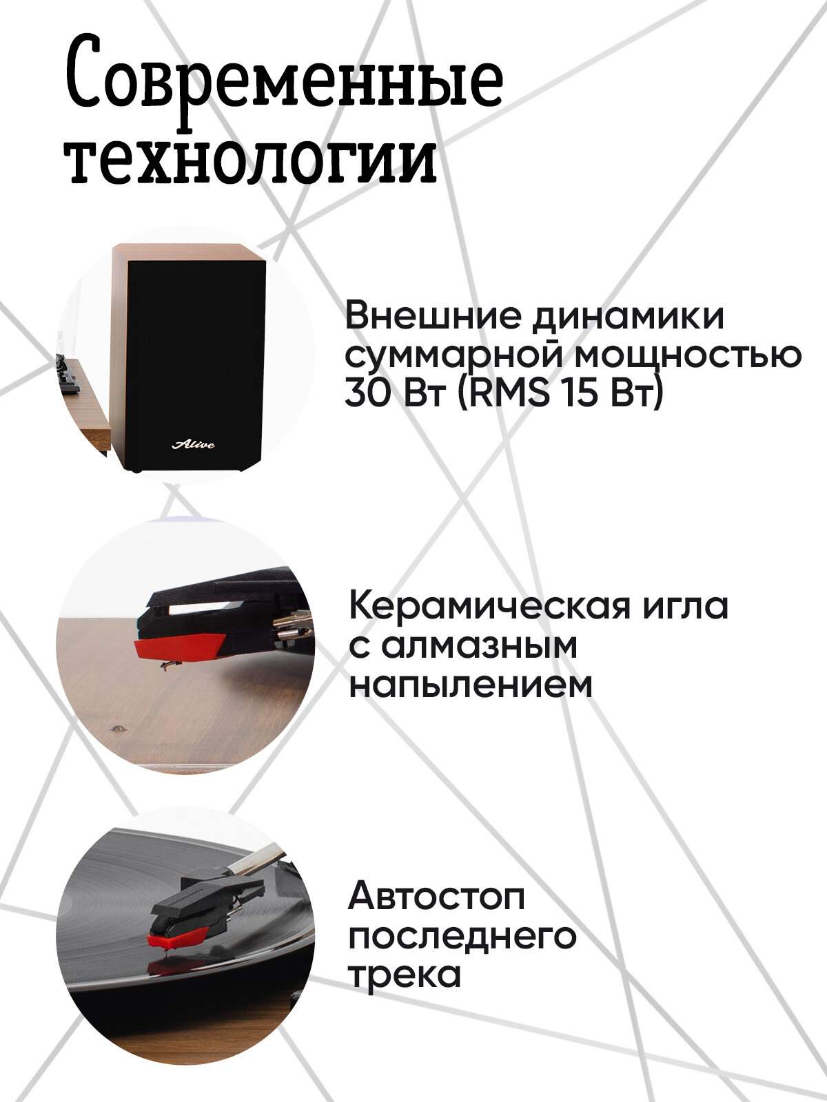 | Комплектация | виниловый проигрыватель Alive Audio Harmony, адаптер на 45 оборотов, инструкция, адаптер питания |