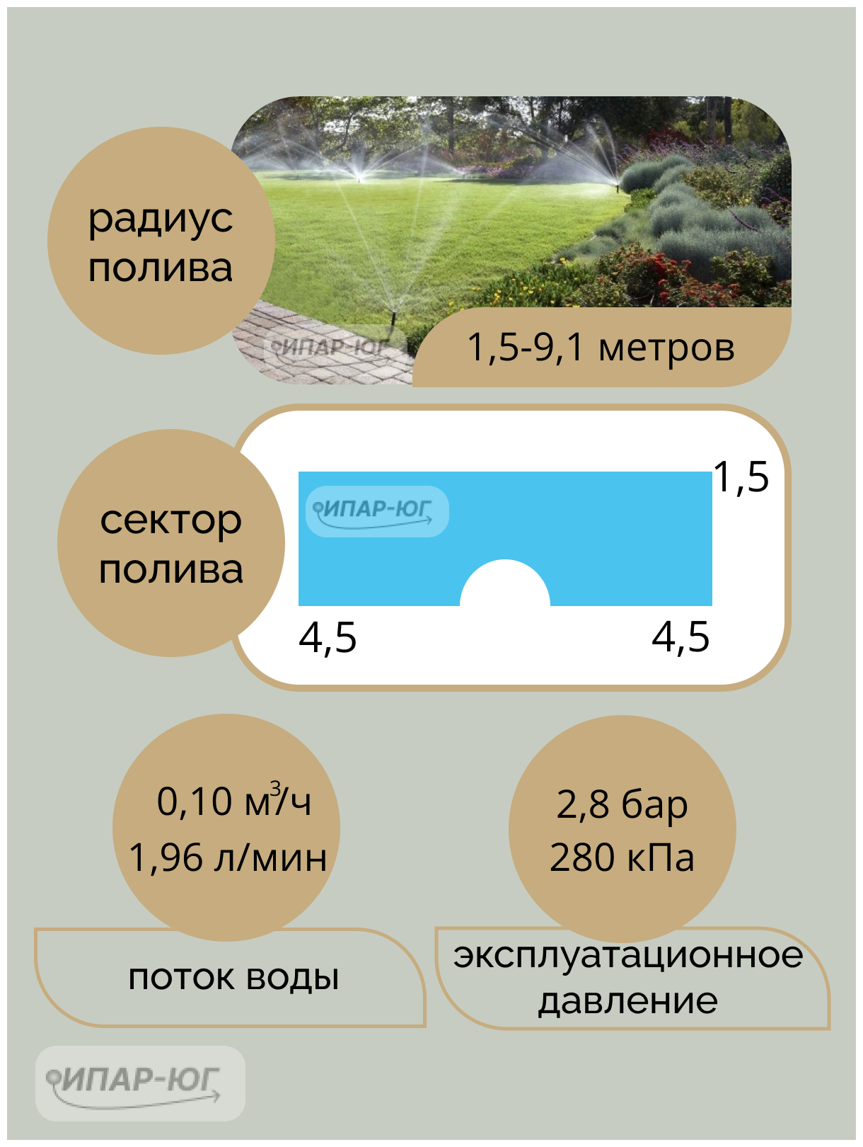 | Дополнительная информация | боковое полосовое распыление; поток 1.34 -1.96 л/мин; ширина полива 1.1 - 1.8 м; дальность полива 8.3 - 9.9 м; давление 1.7 - 3.8 бар; рекомендуемое давление 2.8 бар (радиус полива 1.5 x 9.1 м) |