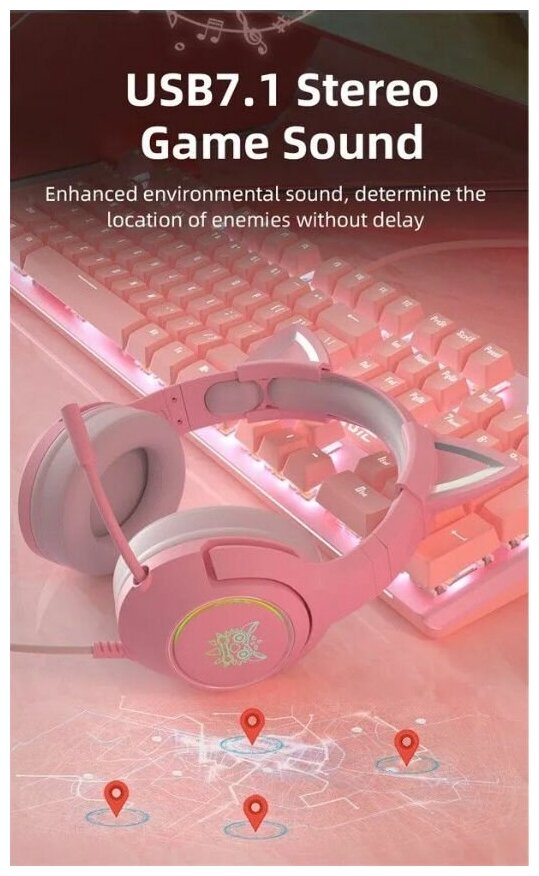 Игровые наушники Onikuma K9-7.1 Pink Cat розовые с кошачьими ушками и подсветкой 3 650 ₽