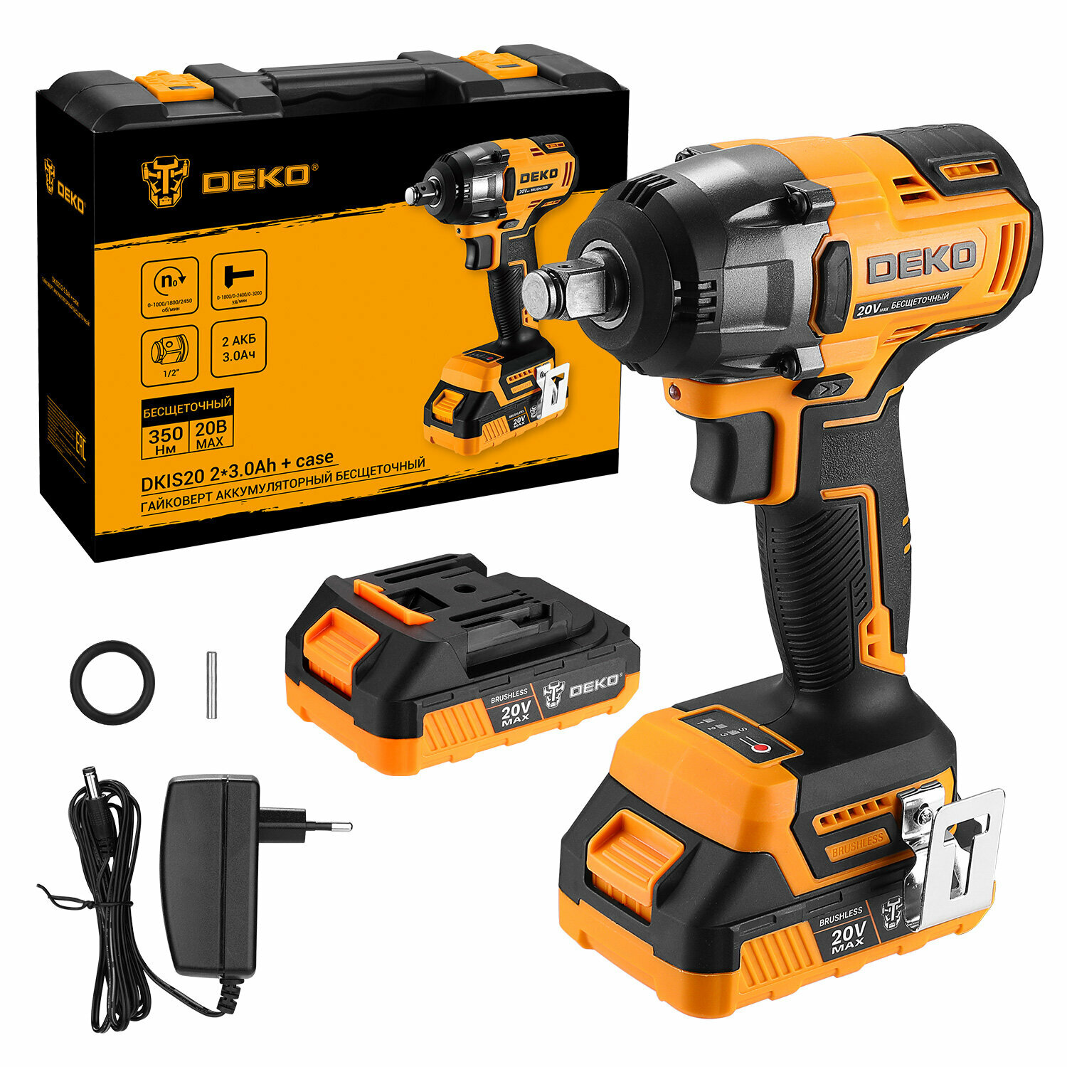 Гайковерт аккумуляторный бесщеточный DEKO DKIS20 в кейсе, 20В, 2*3.0Ач