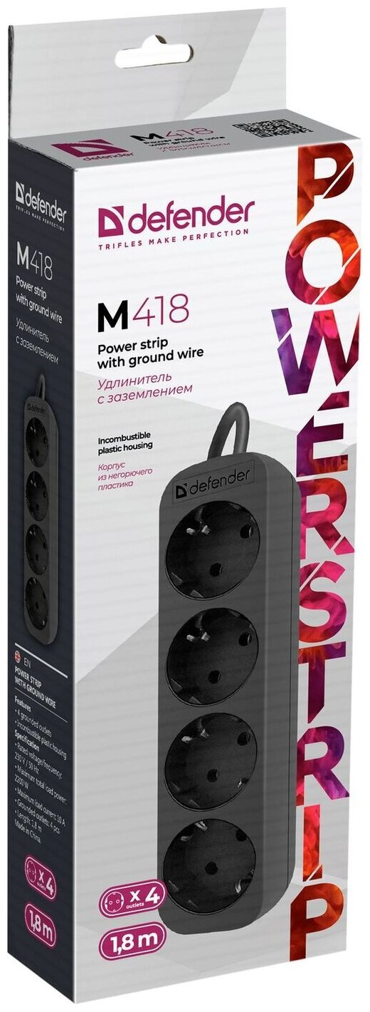 Удлинитель с заземлением Defender M418 1.8 м, 4 розетки, черный (99325)