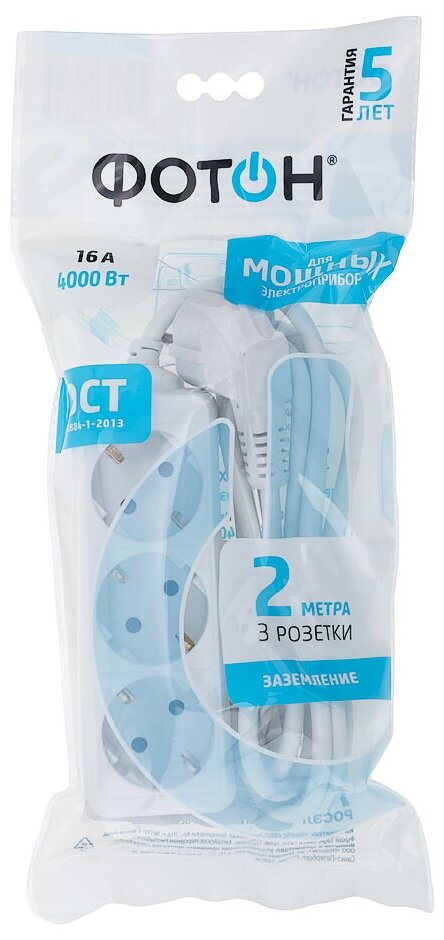Фотон Удлинитель сетевой 16-23Е, 2м, 3 розетки, 16А, с заземл, Белый 21116 информация: