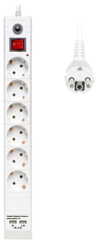 Сетевой фильтр Buro BU-SP1.8_USB_2A-W 1.8 м, (6 розеток), белый