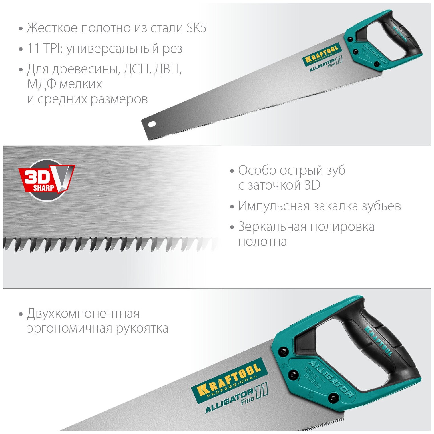Ножовка для точного реза ″Alligator Fine 11″, 550 мм, 11 TPI 3D зуб, KRAFTOOL информация: