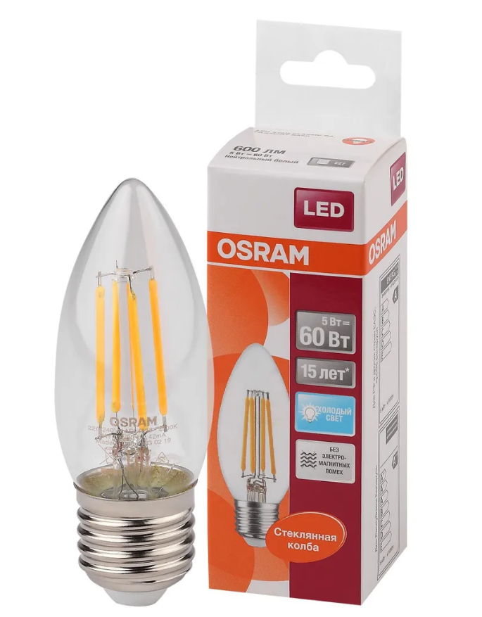 Отзывы на Лампочка филаментная светодиодная OSRAM LED Star, 600лм, 5Вт, 4000К (нейтральный белый свет), Цоколь E27, свеча
