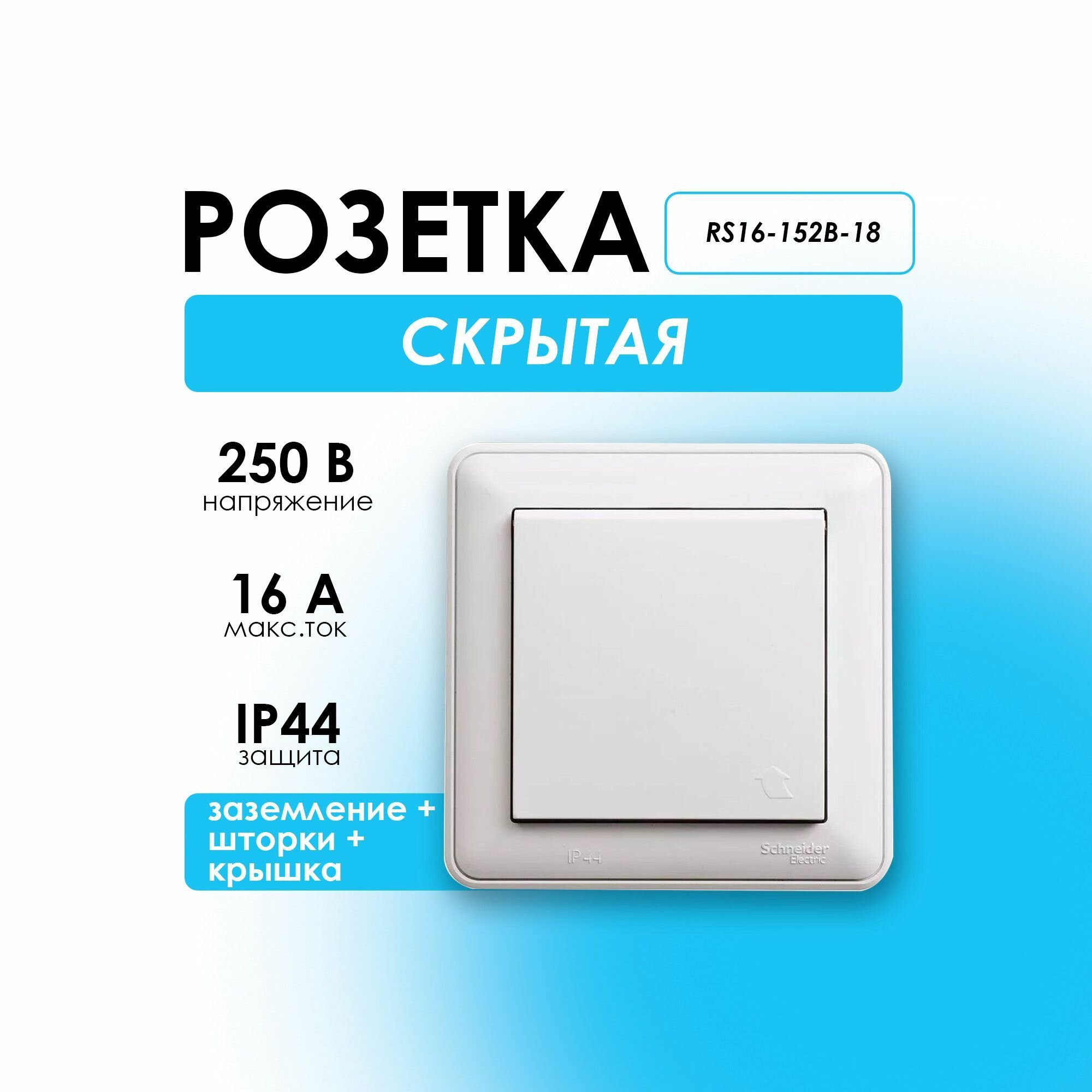 Розетка W59, скрытый монтаж, с заземлением, с крышкой, со шторками, белый. RS16-152B-18 Schneider Electric информация: