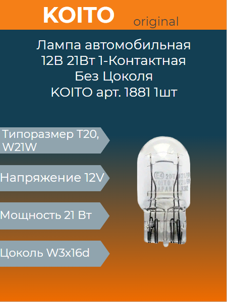 Лампа 12v W21w 21w W3x16d Koito 1 Шт. Картон 1881 KOITO арт. 1881 760 ₽