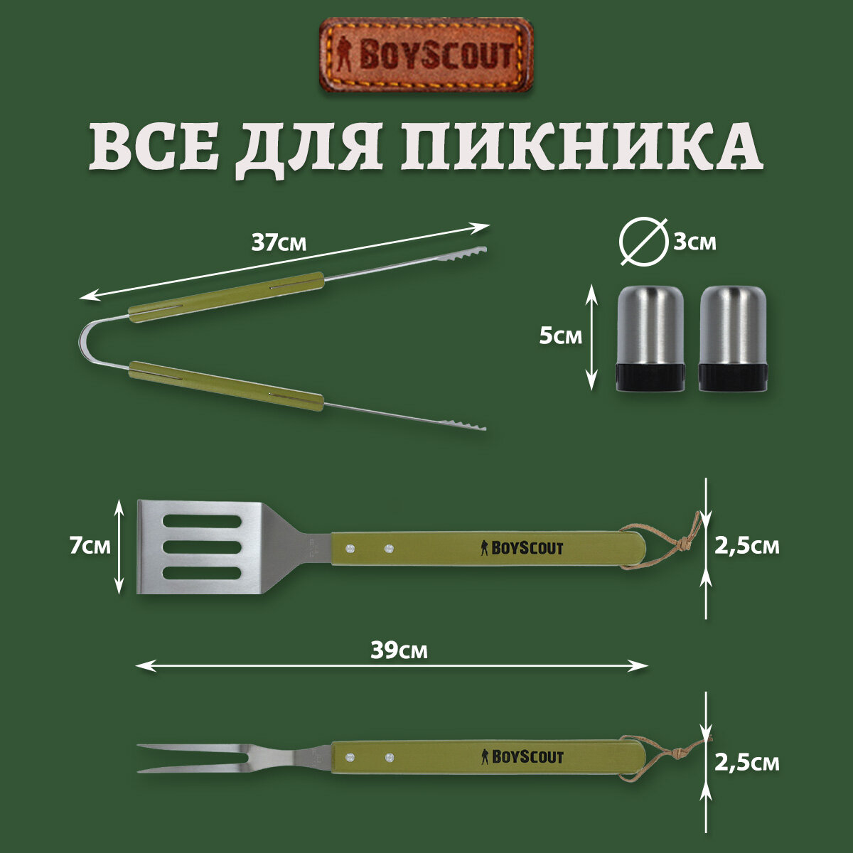 Отзывы на Набор (сумка-фартук, вилка, лопатка, щипцы, солонка, перечница) BOYSCOUT