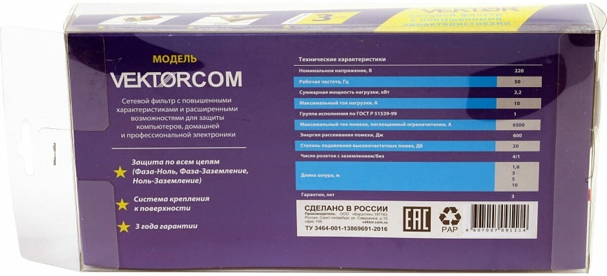10 цен на Фильтр сетевой VEKTOR СОМ, 4 роз. с/з+1роз. б/з, 3,0м
