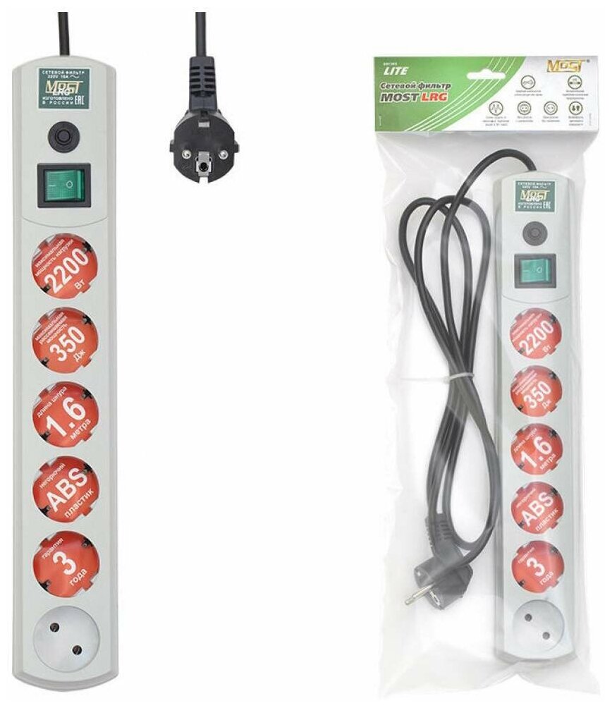 Сетевой фильтр Most LRG 1.6м (6 розеток) белый (пакет ПЭ)