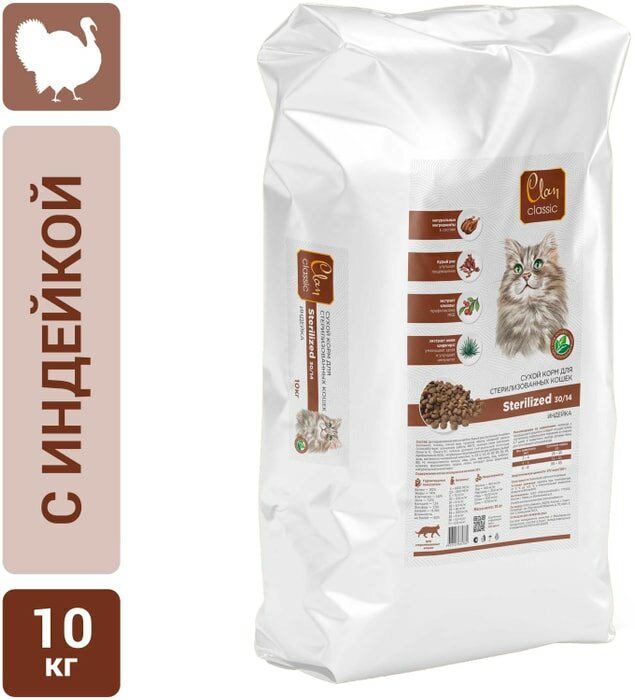 Сухой корм Clan classic для стерилизованных кошек индейка sterilized 30/14 10кг информация:
