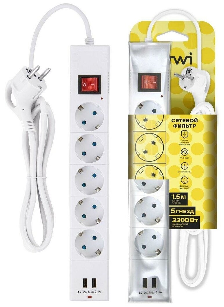 Сетевой фильтр duwi, 5 гнезд, с/з, ПВС 3*0,75, 2USB, 1,5м, 2200Вт, 10А, 32590 1