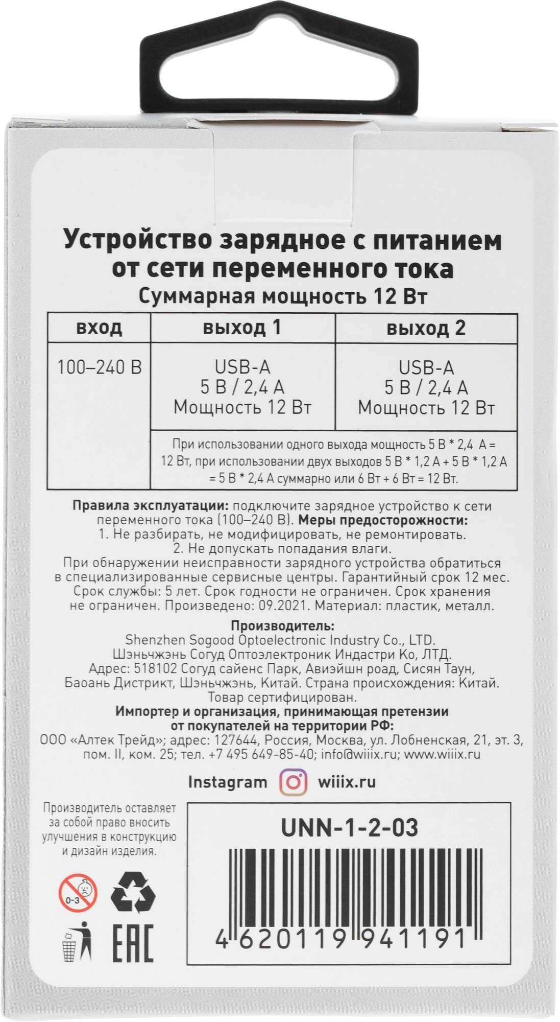 Сетевое зар./устр. Wiiix UNN-1-2-03 2.4A 2xUSB универсальное черный информация: