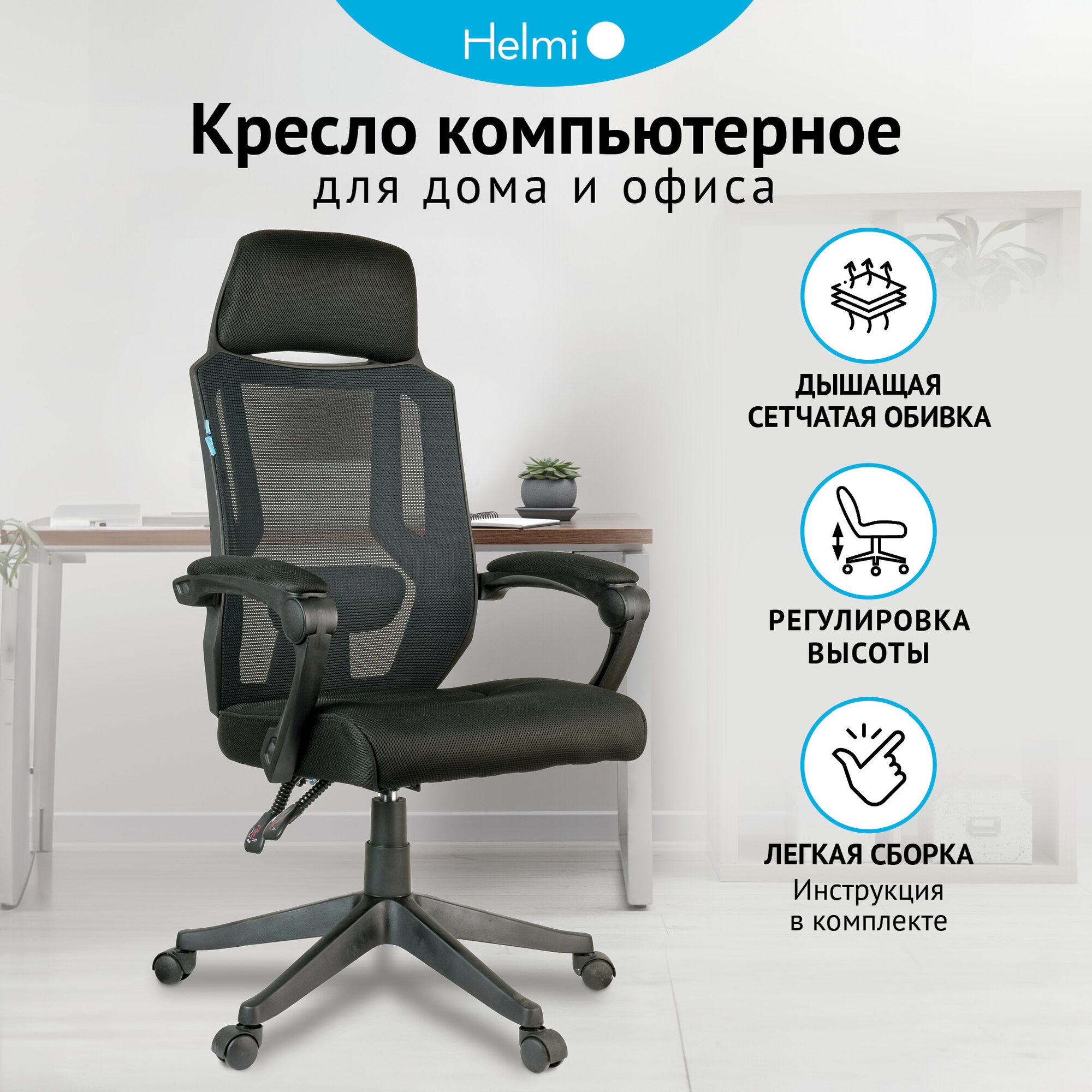 10 цен на Компьютерное, офисное, удобное кресло (стул) для руководителя с подлокотниками Helmi HL-E32 "Ergo" LUX, рег. подлок., подголов. и пояс. упор, ткань черная