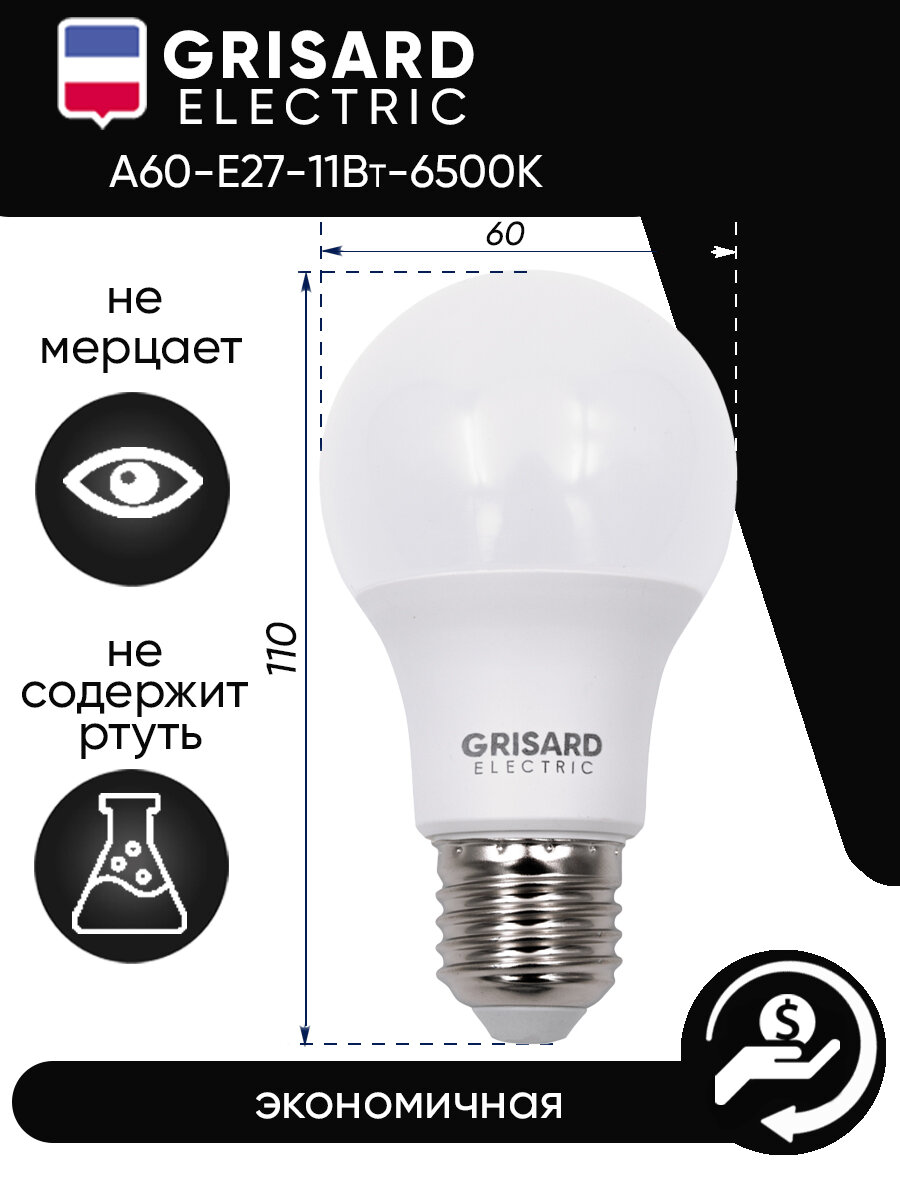 Лампа светодиодная GRISARD ELECTRIC шар A60 Е27 11Вт 6500К 220В 3шт информация: