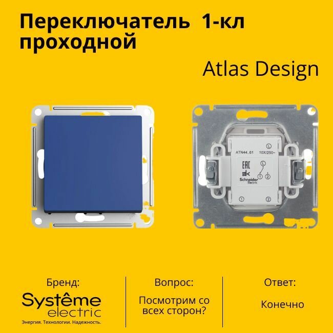 Отзывы на Переключатель проходной Systeme Electric Atlas Design 1-клавишный, 10А, 10 AX, Аквамарин - 10 шт.