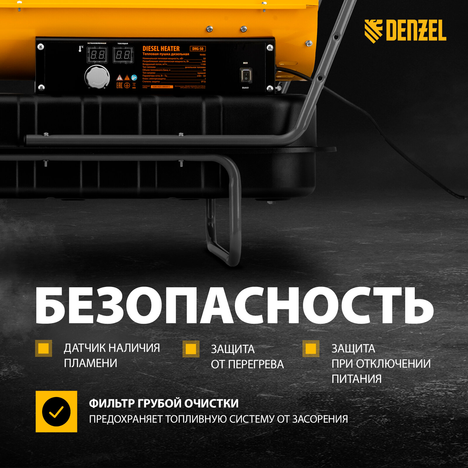 Дизельная тепловая пушка Denzel DHG-50 50 кВт, 1100 м3/ч, прямой нагрев 96486 информация: