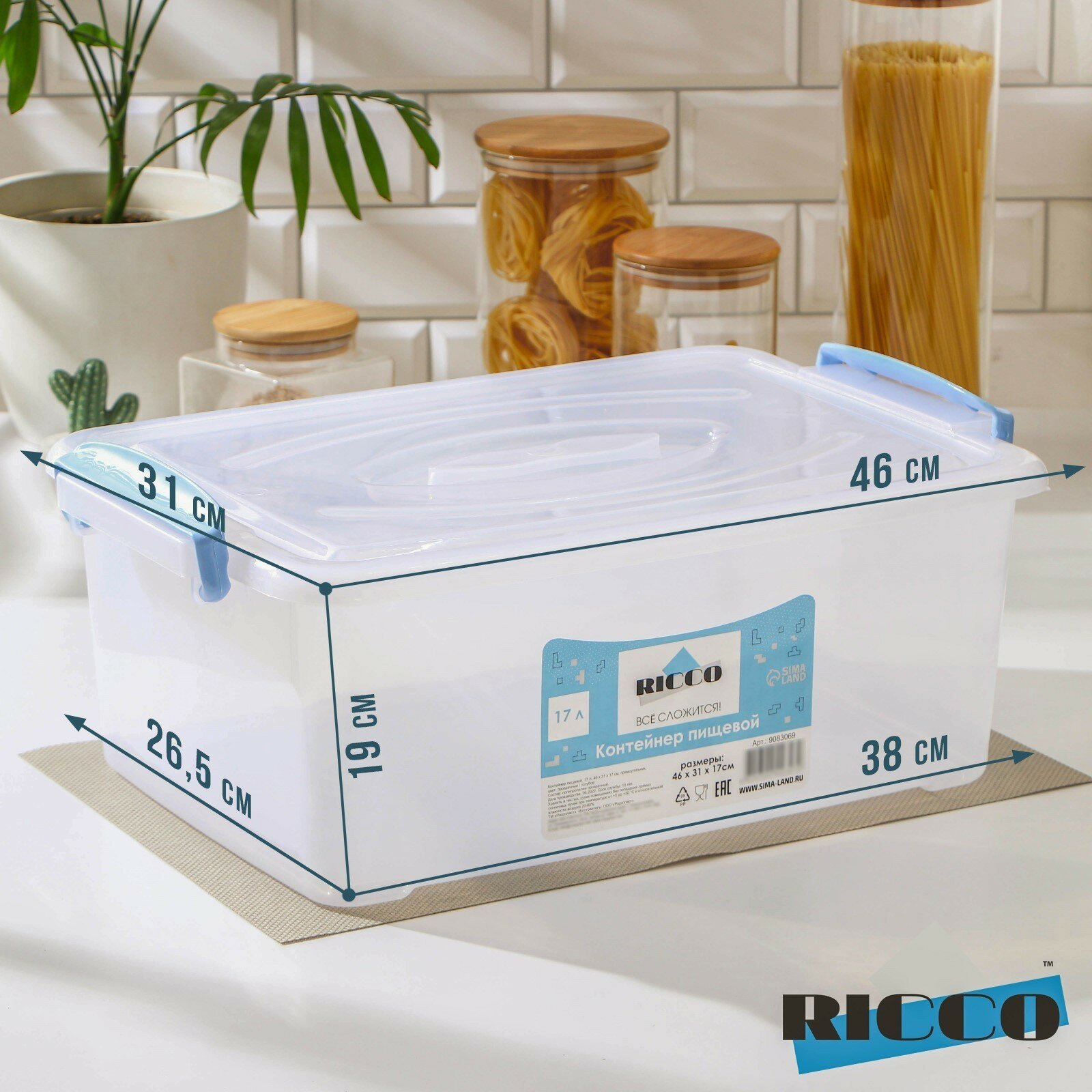 Контейнер пищевой RICCO, 17 л, 46×31×17 см, прямоугольный, прозрачный, голубой информация: