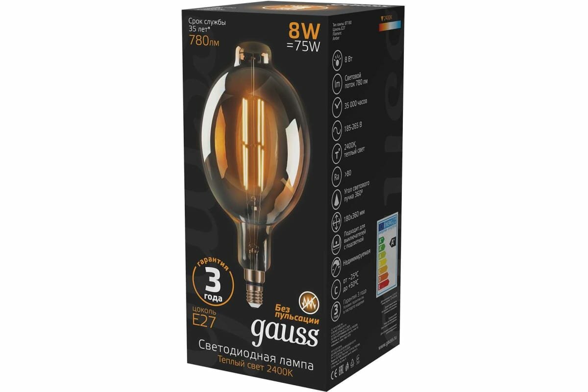 Отзывы на Лампа филам. Gauss Filament Vintage 8Вт цок.:E27 шар 220B 2400K св.свеч.бел.теп. (упак.:1шт) (151802008)