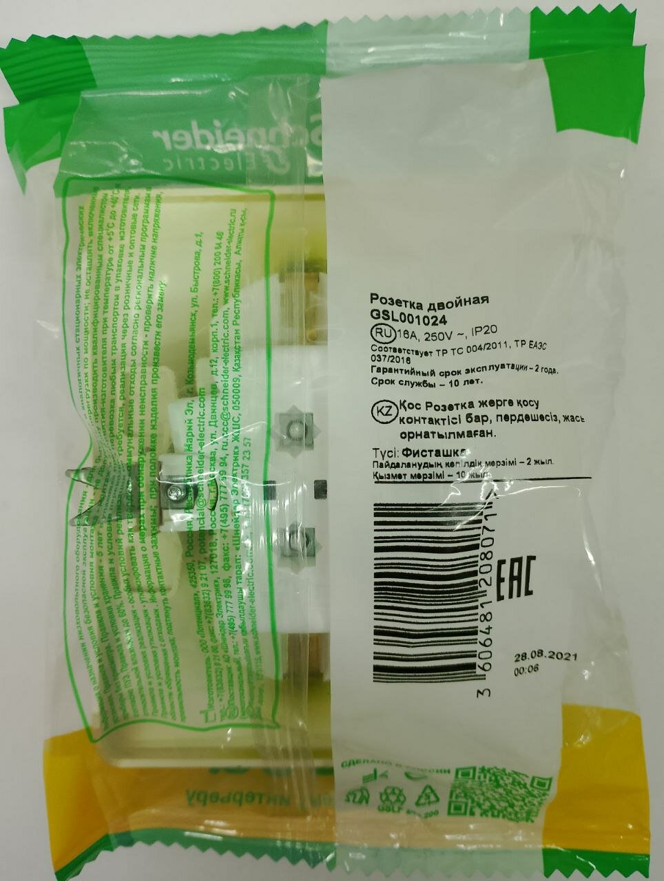 Розетка 2-местная СП Glossa 16А IP20 250В с заземлением в сборе фисташковый SchE, SCHNEIDER ELECTRIC GSL001024 (1 шт.)