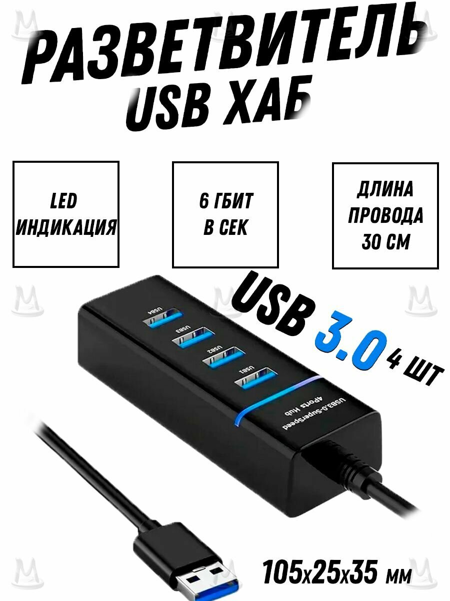 USB HUB зарядка 3.0 на 4 порта, разветвитель адаптер юсб хаб концентратор для ноутбука и компьютера информация: