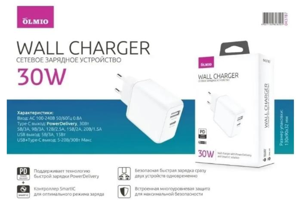 Отзывы на OLMIO З/У OLMIO (043787) 30W, Type-C +USB, PowerDelivery, белый