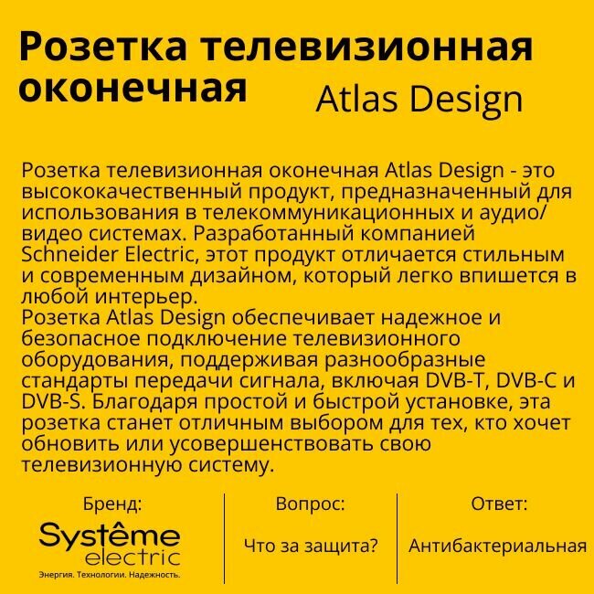 5 шт. Systeme Electric AtlasDesign Бежевая , Розетка TV оконечная 1DB, механизм, ATN000291 3 207 ₽