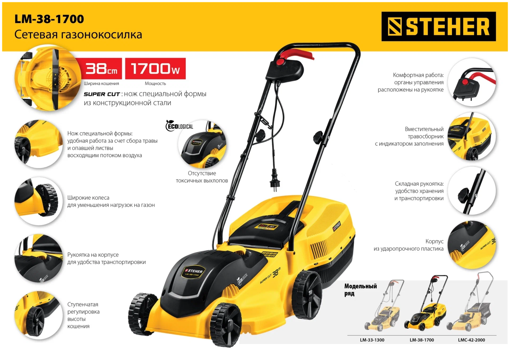 STEHER 1700 Вт газонокосилка сетевая, ш/с 38 см (LM-38-1700)