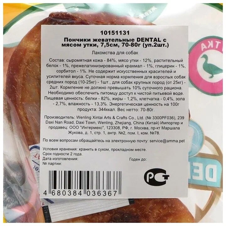 Triol Dental пончик жевательный с мясом утки 70-80г (2шт в упаковке) 7,5см информация: