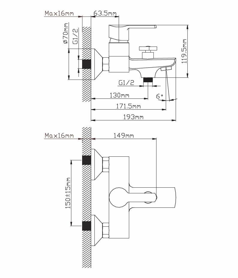 Смеситель на раковину настенный Эверест B46-350 с круглым поворотным изливом, кран-буксы 1/2", хром