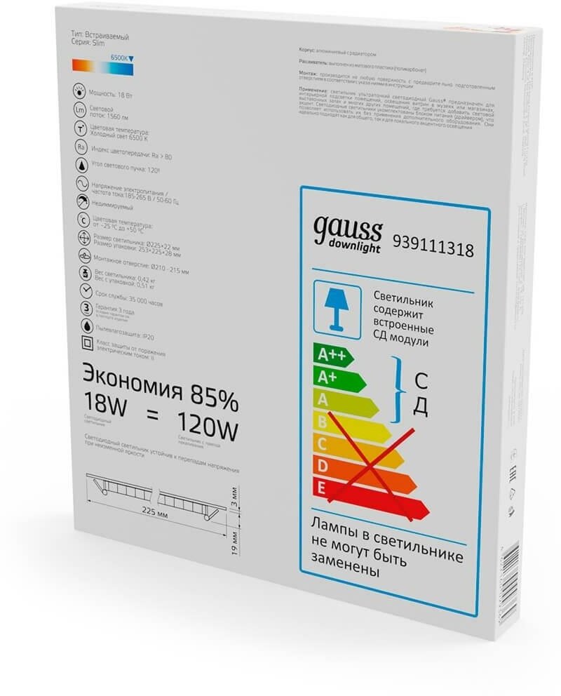 Светильник встраиваемый светодиодный белый 18 Вт 6500К IP20 Gauss Slim ДВО (939111318)