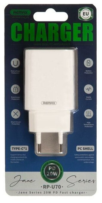 Отзывы на Зарядное устройство REMAX RP-U70, Jane Series 20W PD USB-C, 5V, 3.0A, white 6954851203575