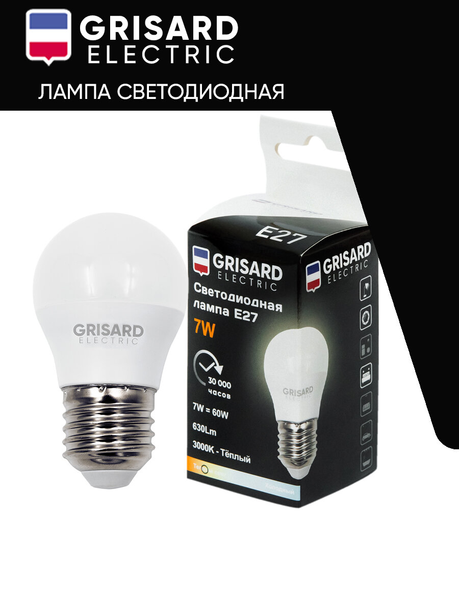 Лампа светодиодная GRISARD ELECTRIC шар G45 E27 7Вт 3000К 220В 1шт информация: