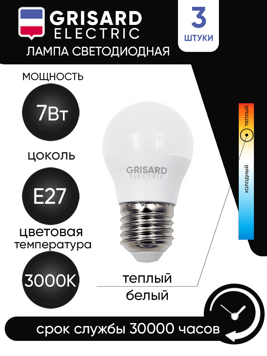 Лампа светодиодная GRISARD ELECTRIC шар G45 E27 7Вт 3000К 220В 3шт информация: