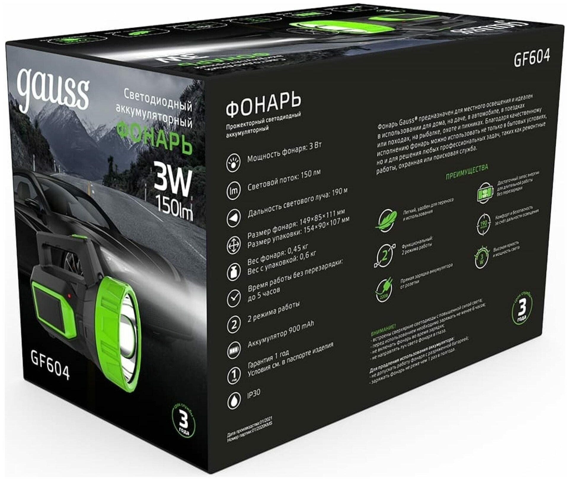 Фонарь прожекторный Gauss модель GFL604 3W 150lm lead acid 900mAh LED 1/10/40