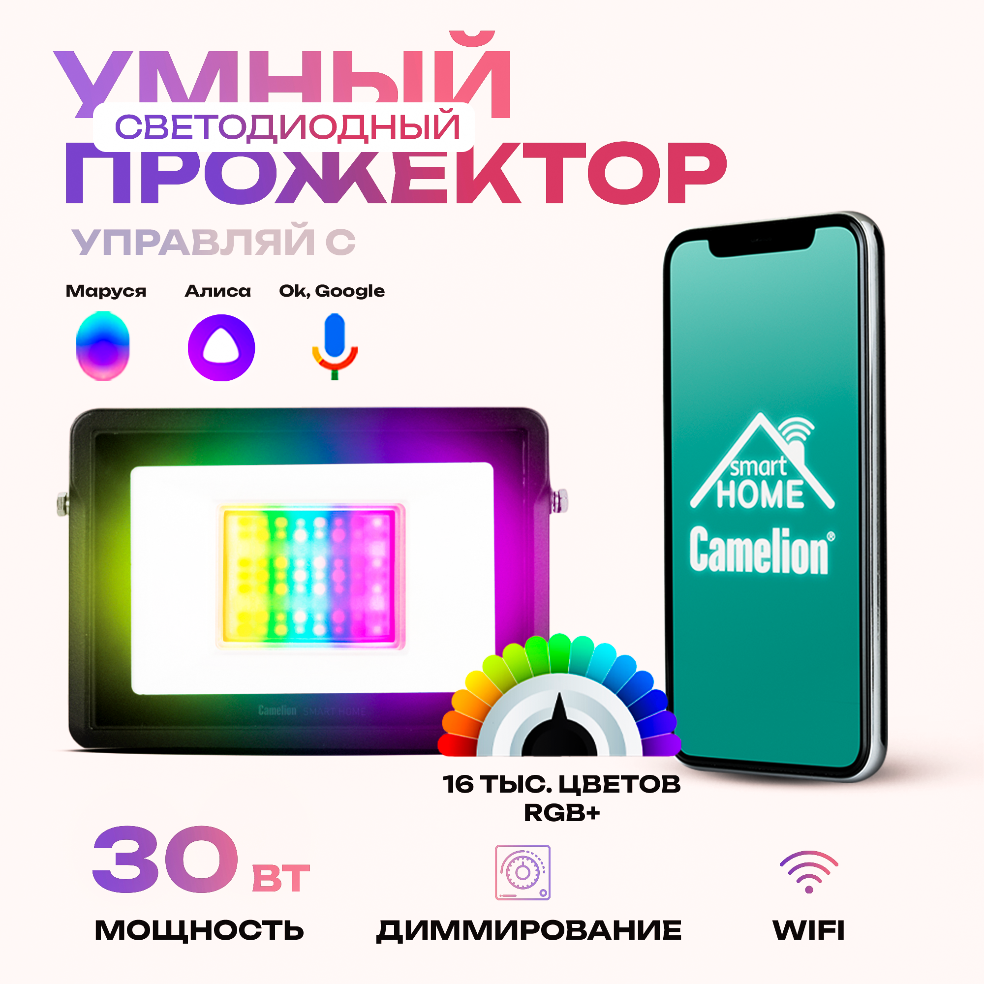 Умный светодиодный LED SMD прожектор 30Вт 14744 Camelion Smart home LFL/SH-30/RGBCW/WIFI Camelion Smart Home LFL/SH-30/RGBСW/WIFI Wi-Fi Голосовое управление информация: