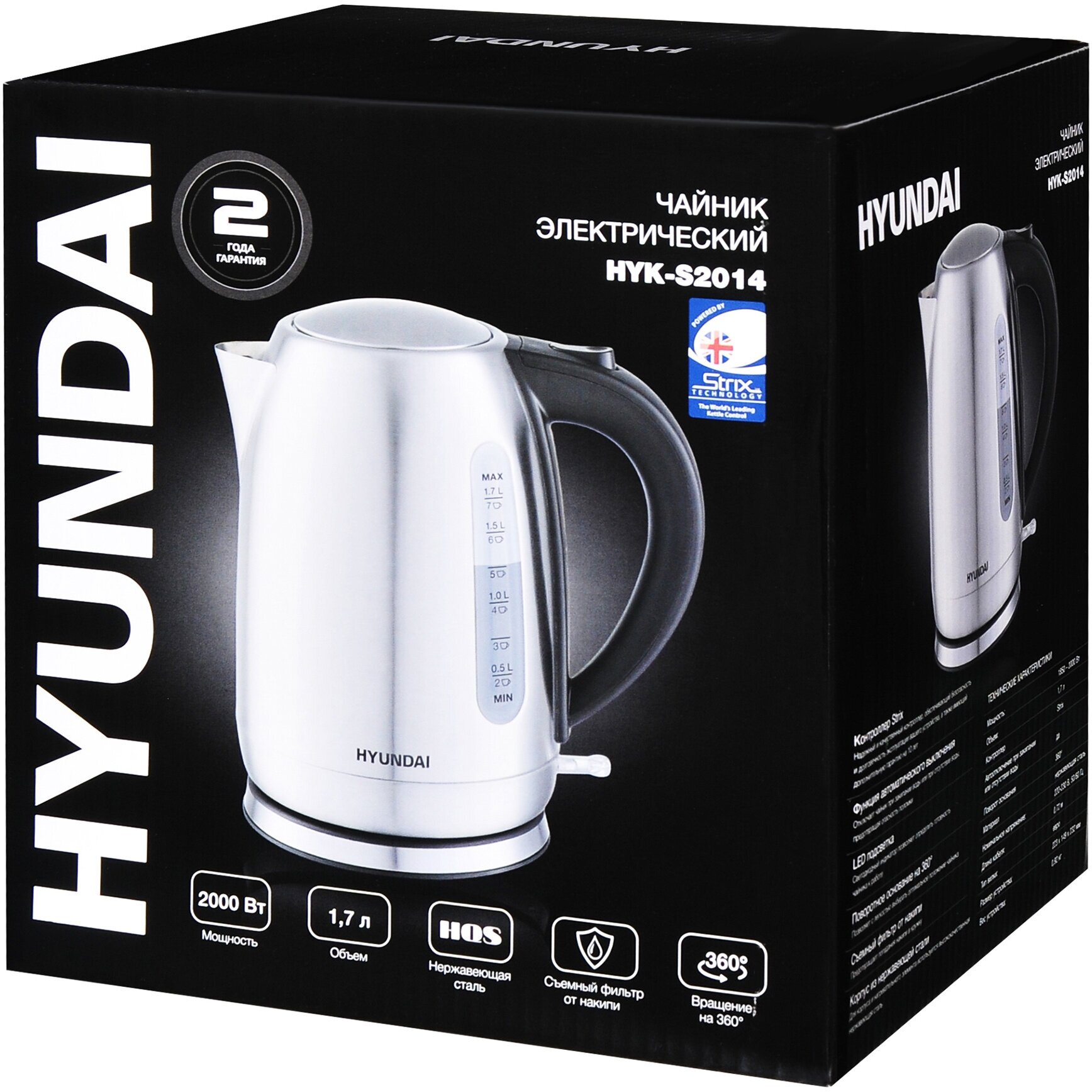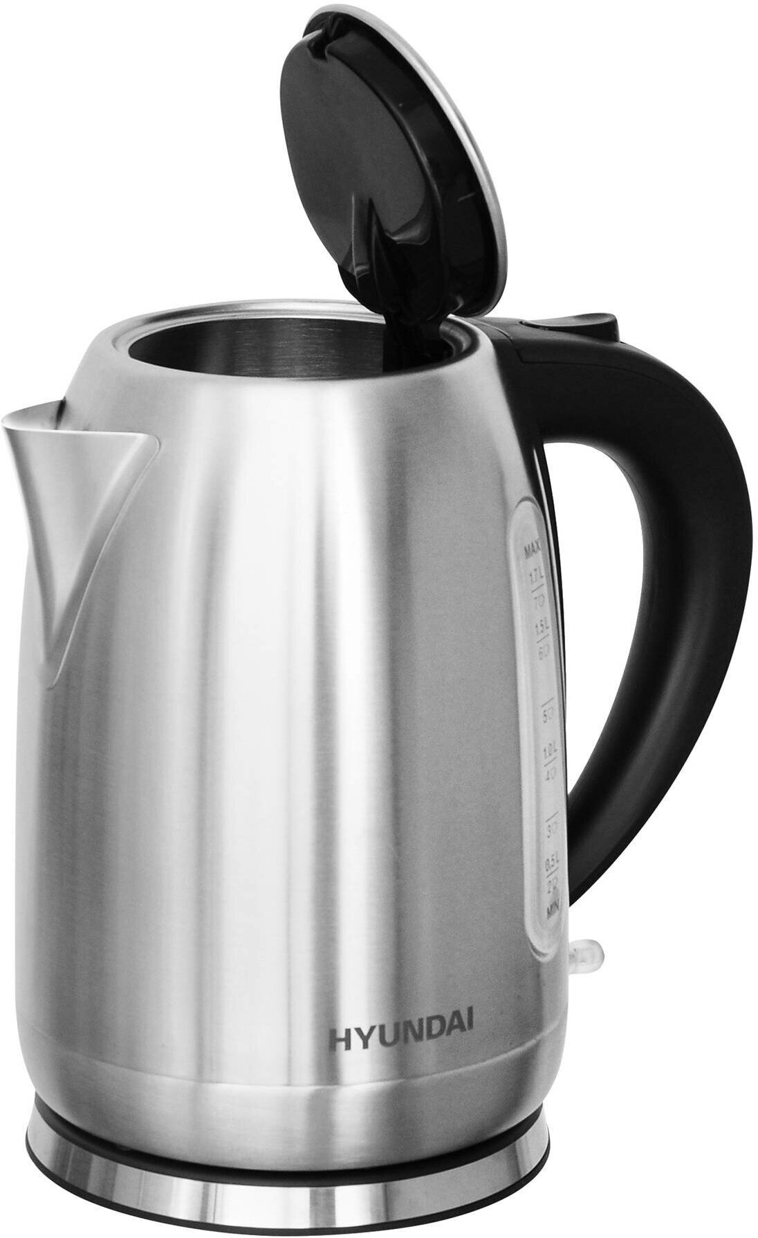 Электрочайник Hyundai HYK-S2014 [нержавеющая сталь, 1.7 л, 2200 Вт, фильтр, скрытый нагревательный элемент, серебристый, черный]